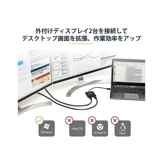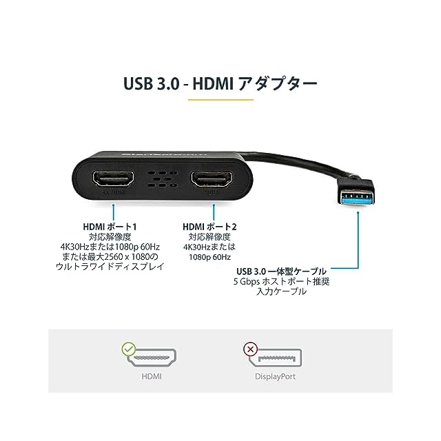 商品名:StarTech.com USB 3.0 - HDMI変換アダプター/2画面/4K30Hz+1080p/Windowsのみ macOS ChromeOS Linux非対応 USB32HD2