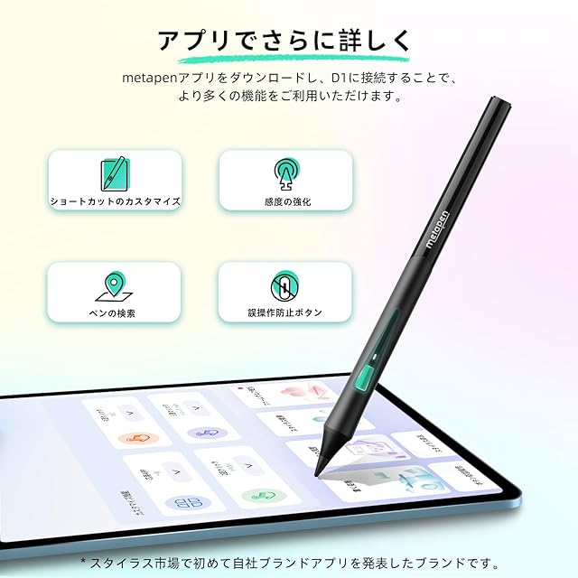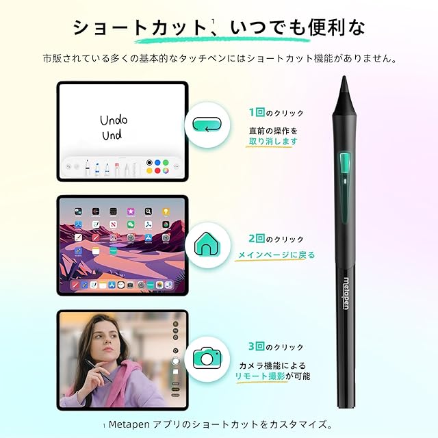 ・設定可能なホットキー& metapenのより多くの機能・Metapen iPad 専用ペン D1はiPadの使用をもっと便利になります。Bluetoothでペアリングしたら、ボタンを1回クリックでアンドゥ機能、2回クリックでホームページに戻る、カメラで3回クリックでリモート撮影機能が利用できます。「metapen」アプリでは、ショートカットキーをカスタマイズしたり、より多くの機能「リアルタイム電力表示& ペン先信号の調整& ペンの位置が簡単に確認できる& ボタンの誤操作防止&睡眠時間の設定」を楽しむこともできます。市販されている他のiPad Pencilにはそのような機能はありません。Metapenが最良の選択です!