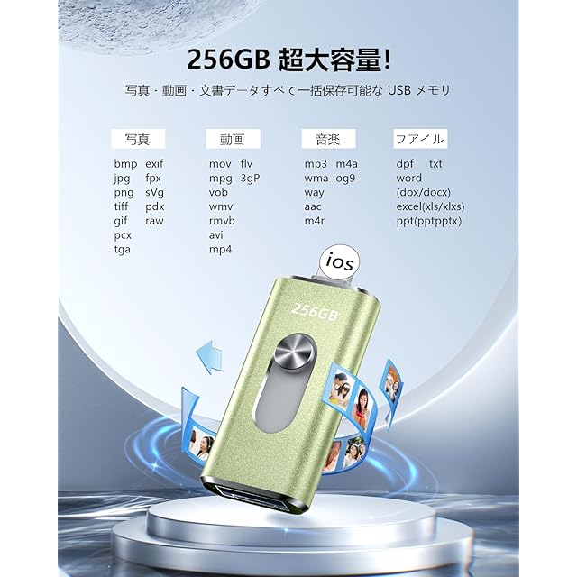 商品名:256GB usbメモリ【アプリ不要・アルバムから写真保存】4in1プッシュ型 Phone対応 スマホ携帯 高速 データ保存 バックアップ iOS/Type-C/USB/Micro USBフラッシュメモリ 外付けストレージ スライド式 容量不足解消 usbメモリ!256GB Green