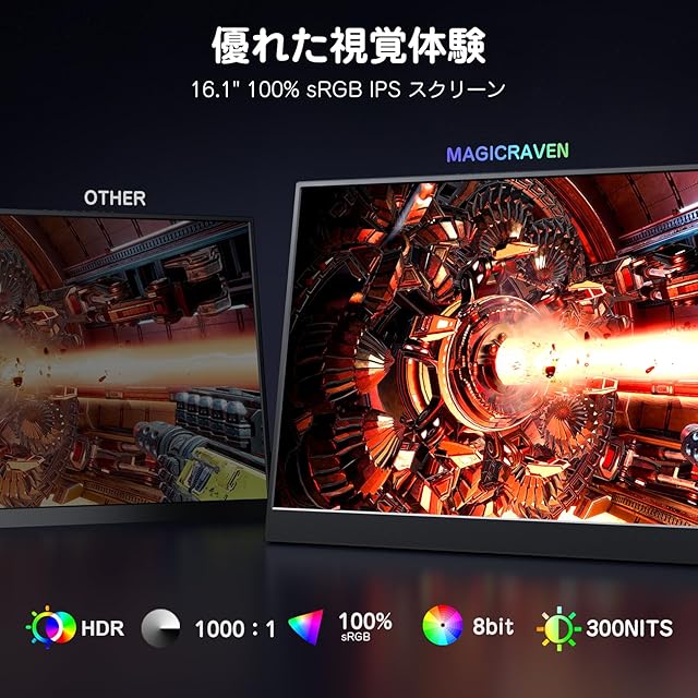 商品名:MAGICRAVEN モバイルモニター 144Hz 高速応答 16.1インチ - モバイルディスプレイ FHD 1920x1080 16:9画像比 広色域 超軽量 超薄型 ポータブルモニター 非光沢 IPS液晶パネル ブルーライト機能 疲れ目軽減 スピーカー内蔵 HDRモード対応 Type-C/mini HDMI接続 PS4/PS5/XBOX/Switch/PC/Mac