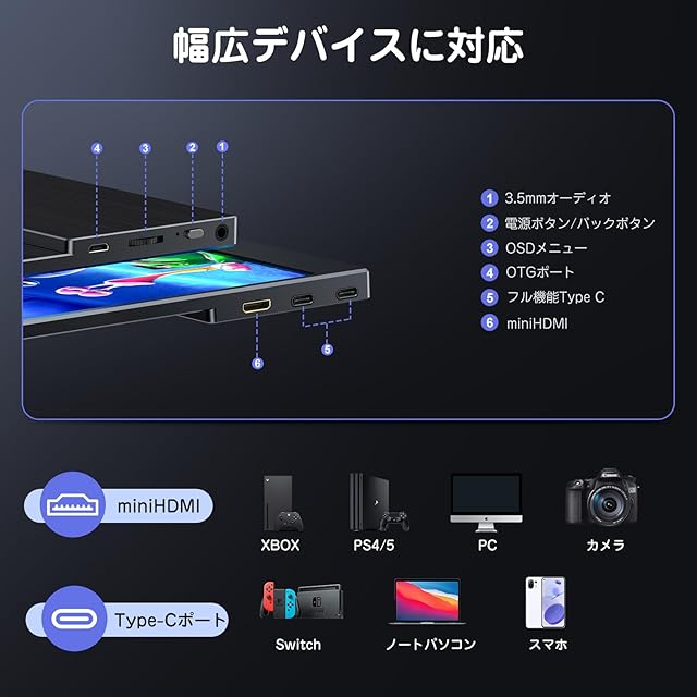 【幅広く接続に対応・ケーブル1本接続】このモバイルモニターは、Mini HDMI、Type-C、3.5mmイヤホン、OTGポートを搭載し、さまざまな接続方法を実現しています。特に便利なのは、Type-Cケーブル1本で映像出力と給電を同時に行える点です。ただし、Type C端子で接続する場合、端末がDP ALT MODEに対応している必要があります。また、接続端末からの電力供給が不足する場合は、電源アダプターを使用してください。