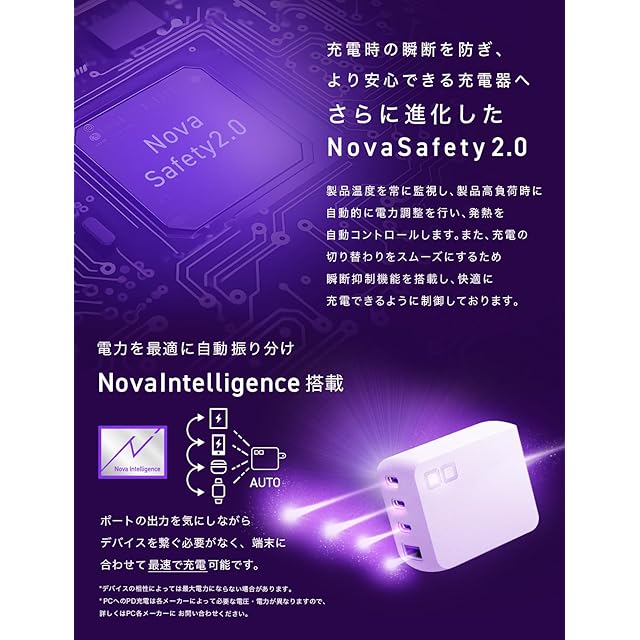 【Nova Intelligence搭載で電力を最適に振り分け】ノートPCやスマホなどの端末に自動で出力を調整して充電が可能な急速充電器。従来のAC充電器のように、接続するポートを迷うことなく最速で充電が可能です。※Nova Intelligenceの仕様は急速充電早見表(画像)をご確認ください。