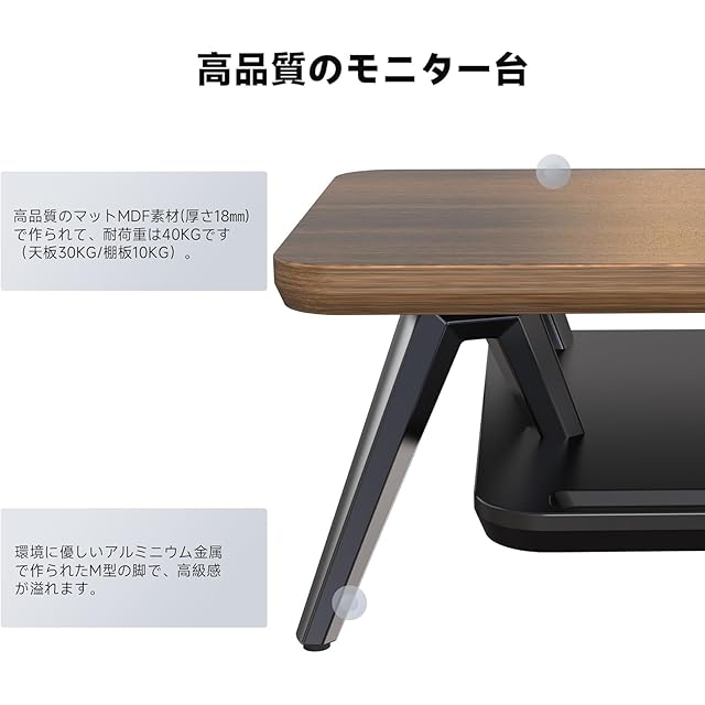 【安心安全な材質 ・優れた安定性】:環境に優しいMDFから作られたパソコン台は耐久性に優れ、M型のアルミニウム脚は高級が溢れながら、天板をしっかりと支えています。机上台の最大の耐荷重はなんと40kgで、安定性もすばらしいです。