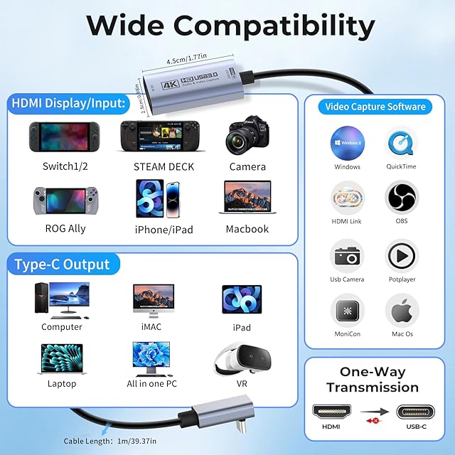 【超低レイテンシの4K 60FPS入出力】このHDMI 4Kビデオキャプチャカードは、ストレートUSB-Cコネクタと3.3フィート(1M / 100cm)ケーブルで、USB 3.0を介して最大4K@60Hzの入出力をサポートし、滑らかで鮮明なビジュアルを提供し、ハイモーションゲームプレイ、VRキャプチャ、iPadコンテンツを実現します。 ストレートコネクタは、標準的なケーブル管理を必要とするデスクセットアップ、ノートパソコン、デバイスに最適です。 USB-Aオス-USB-Cメスアダプターが付属し、USB-AポートとUSB-Cポートの両方を介した接続をサポートし、最大限の柔軟性を提供します。