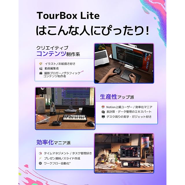 TourBox Lite コンパクト左手デバイス<br> ノートパソコン、デスクトップ、Windowsタブレットなど、さまざまな環境で自由に作業が可能です。<br> コンパクトで手に馴染むエルゴノミックデザインと直感的な操作レイアウトにより、よりスマートで快適な創作体験を実現します。<br> 主要なクリエイティブソフトとのスムーズな連携や、賢いプリセット切り替え、自由にカスタマイズできる操作機能を備え、イラスト制作、軽い編集作業、日常のデジタル作業フローに最適です。