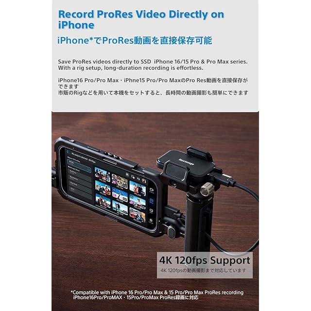iPhone 15, 16 Pro/Pro MAXは、大容量のProRes形式動画を外部SSDへ直接録画可能です。特に4K/120fps, 4K/60fpsの動画撮影を行う際は外部ストレージの接続が必須となります。このSSDを使用することで、高画質な4K映像の撮影をスムーズに楽しめ、容量の大きくなる4K/120fps, 4K/60fps撮影もストレージ残量を気にせず行えます。