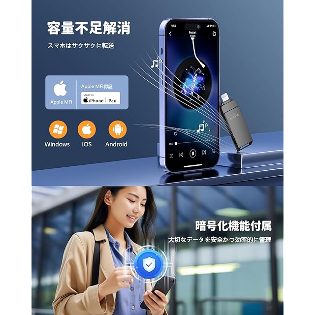 ✔【Apple MFi認証取得・高い互換性】iPhone 用USBメモリでは、アップルが設けた認証プログラム Apple MFi が認定されております。これアイフォン バックアップはアップルより提供されたライトニングコネクタを使って、アップルのサポートを受けて作成された周辺機器です。なので、すべてのiPhoneおよびiPadシリーズと互換性があります。iPhone 14 /14 Pro/13 Pro Max/13 mini/ 12 /12 Pro/12 Pro Max/12 mini/ 11 /11 Pro/11 Pro Max / SE/X /XS/XS Max /XR/8 Plus/8 / 7 Plus/7 /6s Plus/6s/6 6 Plus /iPad Air iPad(第9/8/7/6/5世代)iPad mini(第6/5/4/3世代)10.5インチiPad Pro 9.7インチiPad Pro / iPod touch 6/7/ MacBook Air/Macbook Pro/ iMac/PC /ノートパソコンなどのデバイスに対応します。