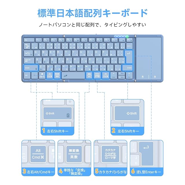 商品名:【最新型】Omikamo キーボード bluetooth 折り畳み式 ワイヤレス JIS標準日本語配列 ipad キーボード スマホ マルチペアリング タッチパッド付き iOS/Windows/Android/Mac/Google対応 無線 コンパクト 軽量 薄型 ipad mini パンタグラフ 充電式(ブルー)