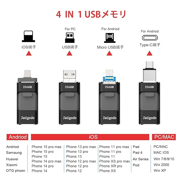 商品名:256GB Phone対応usbメモリ【アプリ不要】 写真保存 直接usbに写真を移す4in1 フラッシュドラメモリ人気 USB 両面挿しスマホ USB メモリー フラッシュドライブ Android パソコン対応 USBメモリ phoneの写真 を パソコン に 取り込む 容量不足解消