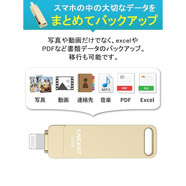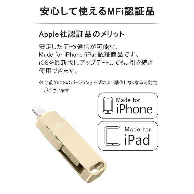 商品名:Vackiit「Apple MFi認証取得」iPhone用 usbメモリusb iphone対応 Lightning USB iPhone用 メモリー iPad用 フラッシュドライブ (金, MFI 認証済み 256GB)
