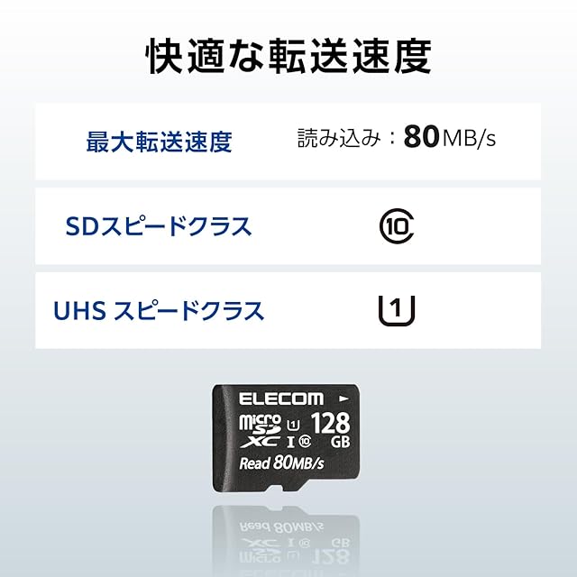 <b>【 仕様 】</b><br>■メモリ規格:microSDXC<br>■スピードクラス:Class10,UHS-I,U1<br>■軸数:microSD<br>■メモリ容量:128GB<br>■最大転送速度:読み込み:80MB/s<br>■最低速度:10MB/s<br>■外形寸法:幅15.0mm×奥行1.0mm×高さ11.0mm<br>■重量:約0.4g<br>■期間:1年間<br>■著作権保護機能:CPRM非対応<br><br><b>【 説明 】</b><br>■高速インターフェース規格であるUHS-I/UHSスピードクラスの「Class1」、および読み書き時の最低速度をするSDスピードクラスの「Class10」に対応したmicroSDカードです。 <br>■読み込み最大80MB/sの高速データ転送を実現します。 <br>■スマートフォンやタブレット、ゲームなどでの使用におすすめです。 <br>■UHS-I非対応機器で使用する場合は、SDスピードクラスの「Class10」に対応します。対応機器で使用することで本来の性能を発揮します。 <br>■※最大転送速度は当社環境による実測値であり、すべての環境においてするものではありません。 <br>■著作権保護機能CPRM非対応です。 <br>■「JIS防水保護等級7(IPX7)」に準拠し、メモリーカードの交換時などにうっかり水に濡れてしまっても安心の防水仕様です。 <br>■自社環境認定基準を1つ以上満たし、『THINK ECOLOGY』マークを表示した製品です。 <br>■廃棄物削減に取り組み、製品に同梱する取扱説明書等をペーパーレス化した製品です。<br>