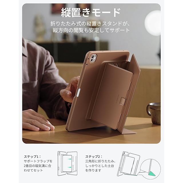 【角度調節でもっと使いやすく】:横向きは3段階の角度調整に対応し、縦向きは独自開発の「三角ダブルロック構造」によって安定したスタンド機能を実現しました。動画視聴からSNSチェックまで、マグネットスタンドのしっかりとした固定設計により安心してお使いいただけます。縦向きで使用する際は、カバーを2番目のマグネット位置にセットし、小さな三角パーツを外側に折り込むことで自立が可能です(内側に折り込んでのご使用はお避けください)
