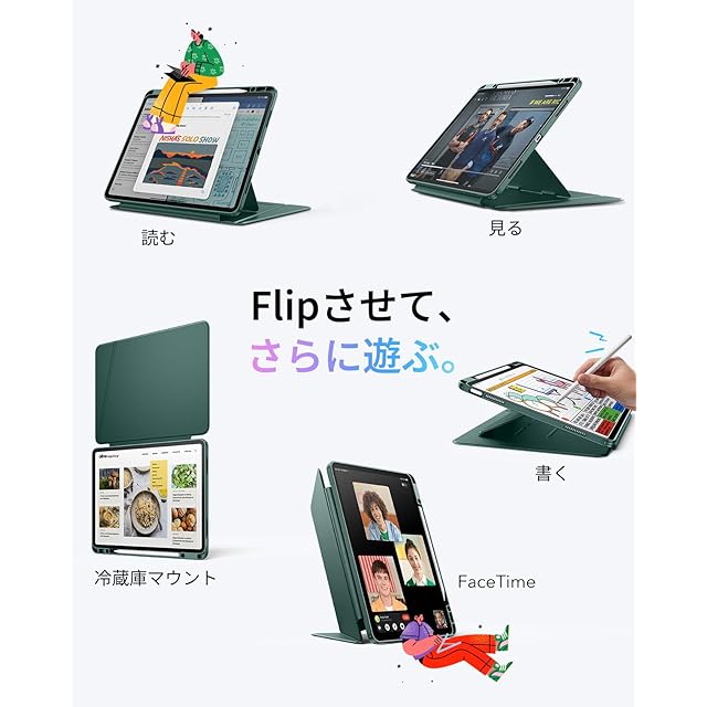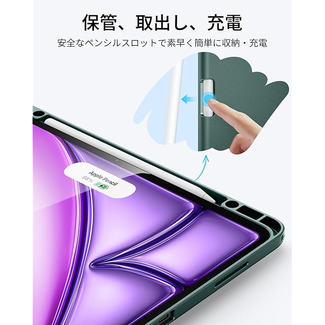 商品名:ESR iPad Air 13インチ ケース (M3/M2、2025/2024) ペン収納 耐衝撃 縦横スタンド 自動ウェイク/スリープ Pencil Pro/USB-C ワイヤレス充電対応 マルチアングルケース Flipシリーズ グリーン