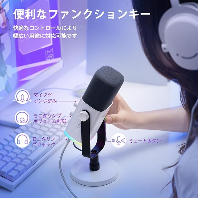 商品名:FIFINE USB/XLRスタンドアロンマイク テレワーク ストリーマー ゲーマー コンテンツクリエイター向け 単一指向性 ダイナミックマイク PC/PS4/PS5/サウンドカード/ミキサー/オーディオインターフェース対応可能 ミュートボタン RGBイルミネーションスイッチ 入力/出力音量調節 ヘッドフォン端子付き 白 AmpliGame AM8W