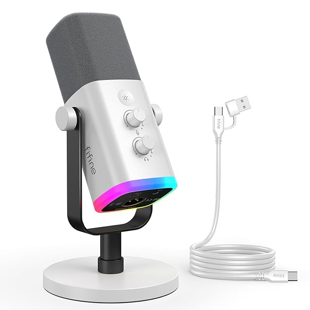 FIFINE USB/XLRスタンドアロンマイク テレワーク ストリーマー ゲーマー コンテンツクリエイター向け 単一指向性 ダイナミックマイク PC/PS4/PS5/サウンドカード/ミキサー/オーディオインターフェース対応可能 ミュートボタン RGBイルミネーションスイッチ 入力/出力音量調節 ヘッドフォン端子付き 白 AmpliGame AM8W
