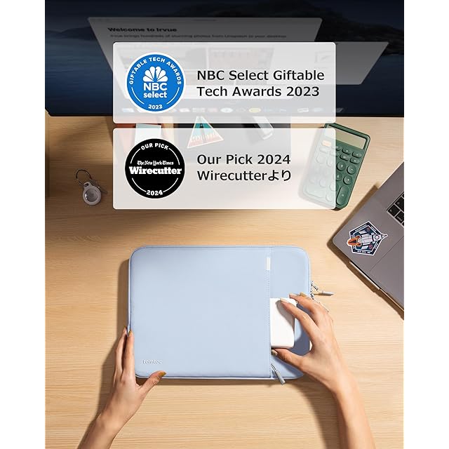 【メディアやお客様からの評判】想像以上の保護力や優れた品質、ピッタリフィットな装着感で、このPCケースは広く高評価されています。Wirecutterより「一番人気のノートパソコンスリーブ ・MacBook Proケース」と褒賞され、さらにNBC Selectより「Select Giftable Tech Awards 2023」を授賞されました。注:Wirecutter :「The New York Times」所属ガジェットレビューメディア。