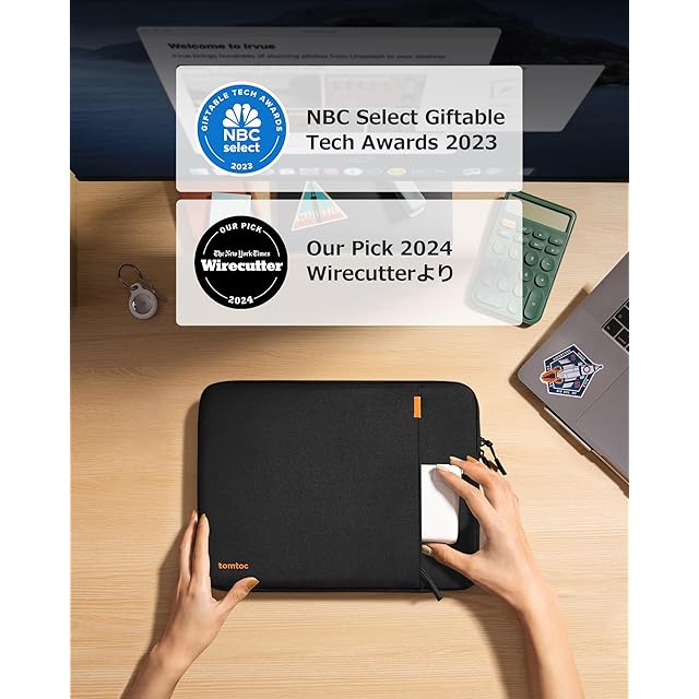 【メディアやお客様からの評判】想像以上の保護力や優れた品質、ピッタリフィットな装着感で、このPCケースは広く高評価されています。Wirecutterより「一番人気のノートパソコンスリーブ ・MacBook Proケース」と褒賞され、さらにNBC Selectより「Select Giftable Tech Awards 2023」を授賞されました。注:Wirecutter :「The New York Times」所属ガジェットレビューメディア。