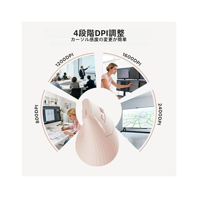 【4 段階 DPI カスタマイズ】 800/1200/1600/2400DPI の 4 段階調整機能を備えたエルゴノミクスマウスは、文書作成・クリエイティブ作業・軽ゲームなど多用途に対応。エルゴノミクス性に加え、操作効率を大幅に高めます