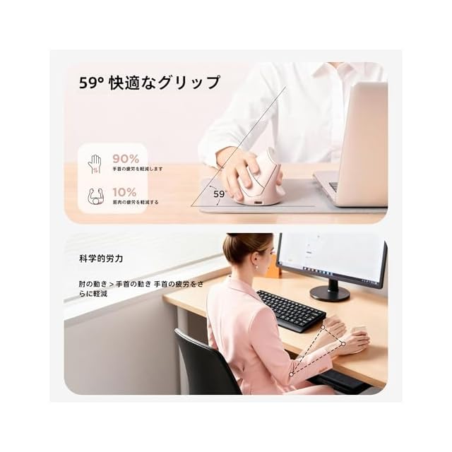商品名:縦型マウス - ワイヤレス充電式 bluetooth マウス、エルゴノミクスマウス、Bluetooth 5.0/4.0 & 2.4GHz 切替対応、電池残量表示、長時間使用疲れないワイヤレスマウス、オフィス在宅両用