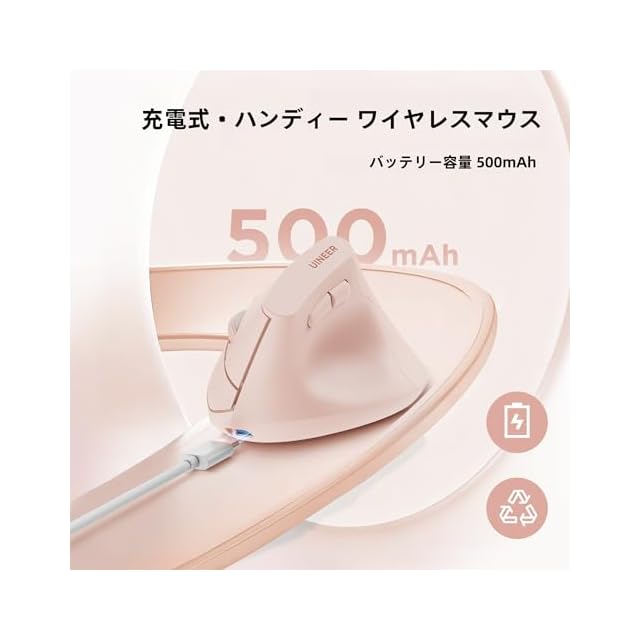 【充電式 & 電池可視化設計】 本エルゴノミクスマウスは充電式バッテリーを内蔵し、本体に LED 電量インジケーターを搭載することで、バッテリー残量をリアルタイムで視認可能です。これにより電源切れを事前に感知でき、USB-C 充電インターフェースを採用するとともに、充電ケーブルを同梱しています