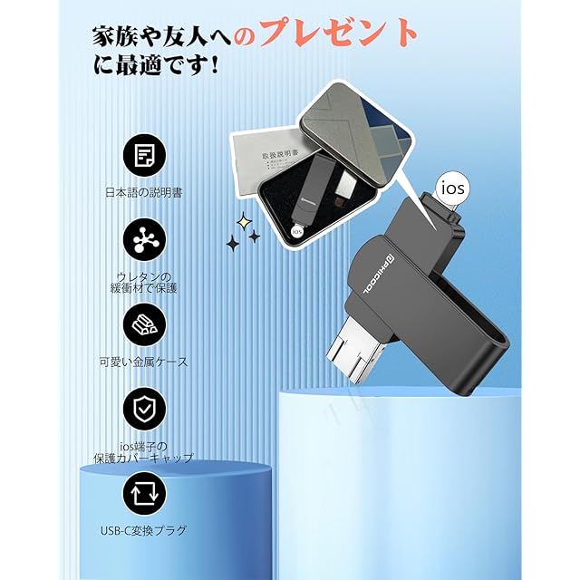 PHICOOL 4in1 USBメモリ 256GB【完全アプリ不要】から直接保存 外付けストレージ ▼3秒で始まるスマート生活 phoneのアルバムを開く→保存したい写真を選択→「USBへ転送」をタップ。 これだけで瞬時にデータ保存!クラウドサービスの月額費もWi-Fi環境も不要。 ▼2024年最新モデル完全対応 └ 16 Pro Max/16シリーズ~ 8まで全世代対応 └pad Pro(M2チップ搭載機種)/MacBook Air 15インチ等最新端末でも安定動作 └Type-C××USB3.0×MicroUSBの4WAY接続 ▼PHICOOLだけの5大革新 軍事級保護:航空アルミニウム合金ケース+内部緩衝材で2m落下耐性 超直感設計:カラー図解マニュアル+動画サポート(日本語専任スタッフ常駐) 潔癖症対応:抗菌加工ライトニングキャップ(99.9%菌繁殖抑制) 完全静音:無駄なLEDランプ廃止で会議中も安心使用 和風美学:桜模様刻印の収納ポーチ付属 ▼こんな方に必需品 ✓「Cloudの課金を解約したい」 ✓「孫の動画でスマホがパンク寸前」 ✓「機種変更時のデータ移行が面倒」 ✓「ビジネスデータの物理バックアップが必要」 ▼仕様詳細 ・転送速度:HD動画1GB約12秒 ・対応形式:HEIC/RAW/MP4/PDF等37種 ・動作環境:-20℃~60℃(雪山旅行でも問題なし) ・サイズ:親指サイズ(5.8×1.4cm) ・重量:ストラップ付きでも3.5g