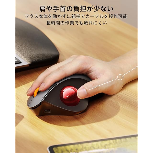 【一日中快適に操作できるトラックボール】最新版人気トラックボールマウスが登場しました!15度の傾斜と手になじみやすいエルゴノミックな形状が採用されており、手首をひねることなく自然な角度で本体を握れるため、長時間でも快適に作業が可能です。また、無線タイプなので、ケーブルの煩わしさから解放されます!さらに、親指で操作するトラックボールマウスは、本体を動かす必要がないため、場所を取らず、膝の上やソファ、乱雑なデスクなどの狭いスペースでも快適なカーソル操作を実現できます。シンプルで使いやすいので、初心者の方におすすめです。(※注意: 本製品は手の小さい方には不向きで、中~大サイズの手に最適です。手のひらの下の細いしわから中指の先端までの長さが17.5cm以上。)
