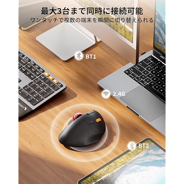 【静かなクリック】このトラックボールはカチカチ音がしない静音スイッチを採用しているため、前モデルより90%以上の操作音を軽減し、オフィスやカフェ、図書館など静かな場所でもクリック音を気にせずに勉強や仕事に集中できます。(※注意: DPI変更ボタン・進む・戻るボタンは静音仕様ではありません)【優れた操球感】光沢仕上げのボールとワイドなボール面は円滑な動きとソフトな感触を提供します。さらに、高密度粒子コーティングが施されており、正確で滑らかなトラッキングを実現しています。これ一台で、想像以上の操球感を楽しめます!