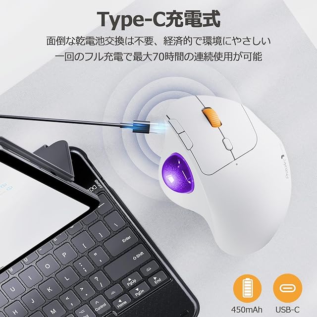 【USB-C充電式・長期間使用可能】面倒な電池交換が不要で、経済的で環境にも優しい充電式トラックボールマウスです。450mAhの大容量バッテリーを内蔵しており、一度のフル充電で最大70時間の連続使用が可能です。また、便利な電池残量表示ランプが付いており、電池切れを心配することなく作業に集中できます。