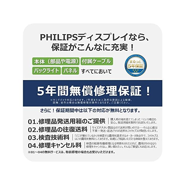 【特長】 23.8インチ、フルHD1920×1080、最大75hz、応答速度4ms(スマートレスポンス動作時)、低入力ラグ、AMD free sync対応、IPS Technologyパネル、ブルーライト軽減、Flicker-Freeフリッカーフリー、HDCP、Smart Image、SmartContrast、OSD日本語対応、Energy Star対応、環境配慮(水銀フリー)。【安心サポート】 お買い上げより5年間無償修理(詳細は製品画像をチェック!)。