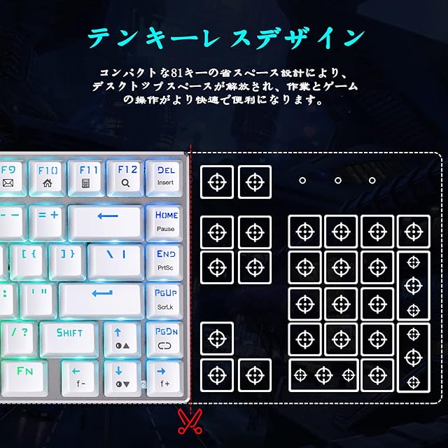 【81キーロールオーバー・コンパクトなサイズ】▶全81キー無衝突。各キーが独立キースイッチを採用し、1つのキーに対して1つの機械式スイッチと金属製のバネ(スプリング)を組み込む特殊な構造です。81キーを同時に押せても干渉されず、意図通りに入力できます。仮に1つのキースイッチが壊れても交換すれば使い続けられ、キーボードを開いてPCBボードを取り外せ必要はありません。メンブレン式キーボードに比べ、耐久性に優れ、打ち心地が絶品と評判が高いです。キーの感触にこだわりのあるユーザーや着実なキー入力が求められるヘビーゲーマーに最高。テンキーレスの81キー小型モデル、サイズが幅310mmでマウスの動作を邪魔になれず、省スペースで使えるのがメリットです。
