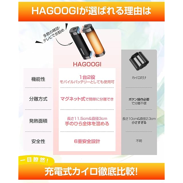 商品名:HAGOOGI (ハゴオギ) 充電式カイロ 360°全面発熱 3秒急速発熱 3階段温度調節 電気カイロ モバイルバッテリー機能 大容量 クリスマスプレゼント 10000mAh 14時間連続発熱可能 【新型磁気式/分離式設計】 小型 超軽量 持ち運びやすい 5V/2A急速充電 旅行 出張 通勤通学用 (ブラック)
