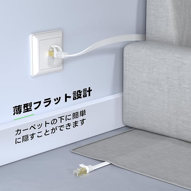 フラット超薄型: Cat8ケーブルのフラットデザインは、ワイヤーの絡まりを避け、スペースを節約し、きれいで安全な設置を可能にします。 ネットワークケーブルは、壁の中、床、ドアの枠、カーペットやラグの下などを簡単に通り抜けることができます