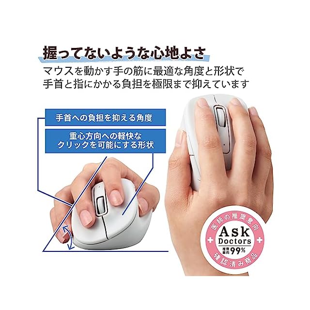 整形外科医との共同開発により自然な手の形のまま使える、握らないマウス“EX-G"シリーズ。手首と指を動かす筋に着目し、マウスを動かす際にかかる身体の負担を極限まで抑えた無線2.4GHz5ボタンマウスです。