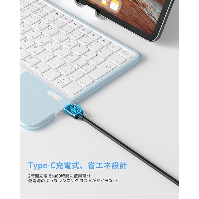 【Type-C急速充電式&省エネ設計】ipad air キーボードのバッテリー性能が優れており、汎用性の高いType-C充電ケーブルで簡単に充電できるのが魅力的で、1回の充電で200時間使用でき、15分間使用しない状態が続くと自動的に省電力モードに移行する省エネ設計で、頻繁にキーボードを使う人におすすめです。