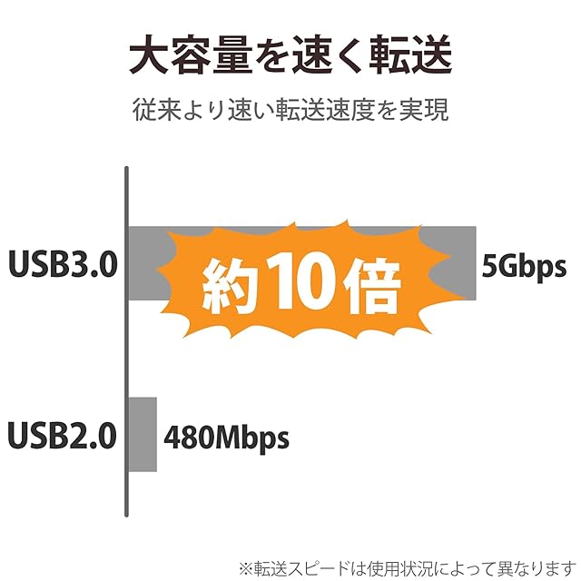 転送速度5Gbpsと従来のUSB2.0の約10倍の転送速度(理論値)を実現するUSB3.0に対応しています。