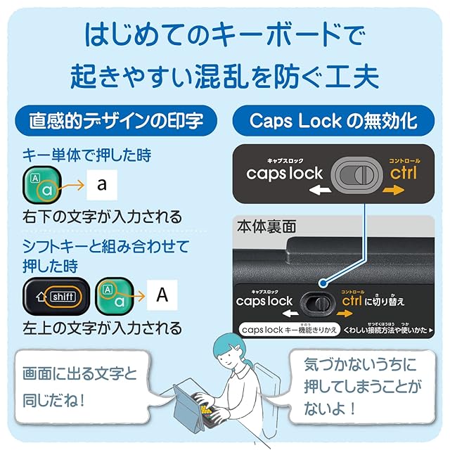 実際に入力される文字と同じ印字デザインで、アルファベットに不慣れな子どもたちの混乱を防ぎます。