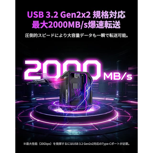 商品名:Acer Predator 外付けSSD 4TB GP30 USB3.2 Gen2x2 最大読出2000MB/s RGB発光型 ポータブルSSD 4K ProRes撮影対応 アルミ合金 USB A/Cケーブル付属 Windows/Mac OS、PS5、Android、iPhone15シリーズ以降対応 金属筐体 メーカー5年