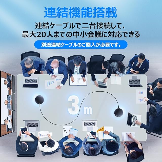 【高い交換性・二台連結できる】EMEET M3会議用マイクスピーカーはデバイスOS(PC、Mac、iOS、Android)を問わずに対応できます。また、Zoom、Skype、Microsoft Teams、Webex およびほとんどの会議ソフトと互換性があります。EMEET製連結ケーブルを使い、M3スピーカーフォン/EMEET Meeting Capsule360度カメラとの連結ができ、収音範囲および再生範囲を倍に拡張して、12~20人の中小型会議にも対応可能です。ご注意:本製品とMeeting Capsuleを連結する場合には、Meeting Capsuleオプションの3m連結ケーブルをご利用ください。Skype とZoom 以外のソフトでミュートするため、M3とソフトウェア両方のミュート設定が必要です。*別途連結ケーブルのご購入が必要です。
