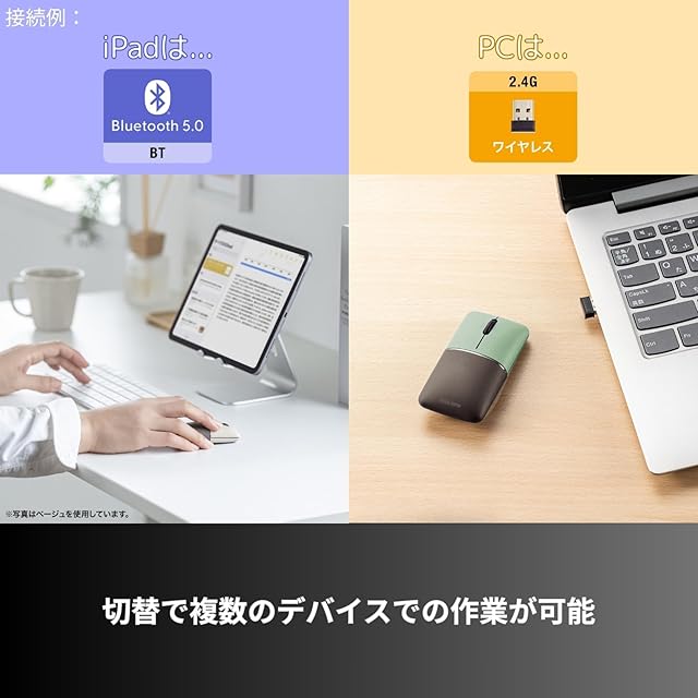 パソコン、タブレットなどいろいろ接続できるBluetoothと2.4GHz対応のコンボマウスです。※同時に使用することはできません。