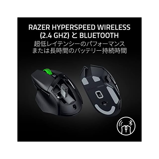 【Razer HyperSpeed Wireless (2.4 GHz) と Bluetooth】 他のワイヤレス技術よりも高速でシームレスかつ、圧倒的な超低レイテンシーのパフォーマンスを発揮し、Bluetooth に切り替えれば長時間のゲームプレイを楽しめます。マルチデバイスサポートによりワイヤレスマウスとキーボードを 1 つのドングルに接続する機能が搭載され、セットアップ環境を簡素化して USB ポートを解放できます。
