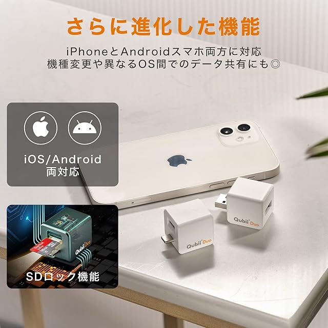 【Qubii Duoがあれば写真取り放題】寝る前にスマホ充電するだけでiPhoneの写真や動画を自動バックアップ!Qubiiがあれば、iPhoneの容量不足には困らず、写真を気兼ねなく取り放題!使いやすくて高速転送。簡単操作で手軽にiPhoneの写真をパソコンにデータ移行することも可能。