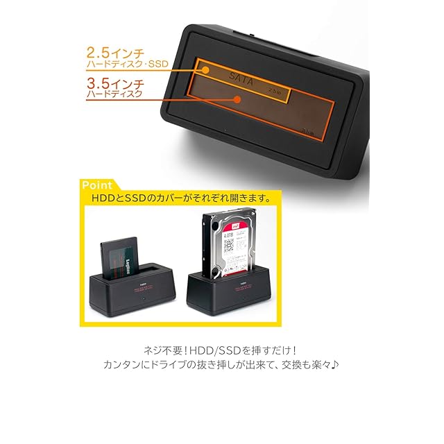 【HDD/SSDスタンド】3.5インチHDD、2.5インチ/3.5インチHDDを搭載できます。ネジ不要、挿すだけでかんたんにご使用いただけます。