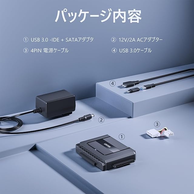 【Unitekバッケージ内容】 IDE・SATA両方対応USBドライブ交換アダプターx1、USB-A/TYPE Cデータケーブルx1、IDE対応4PIN電源ケーブルx1、12V 2A電源アダプターx1、取扱説明書x1