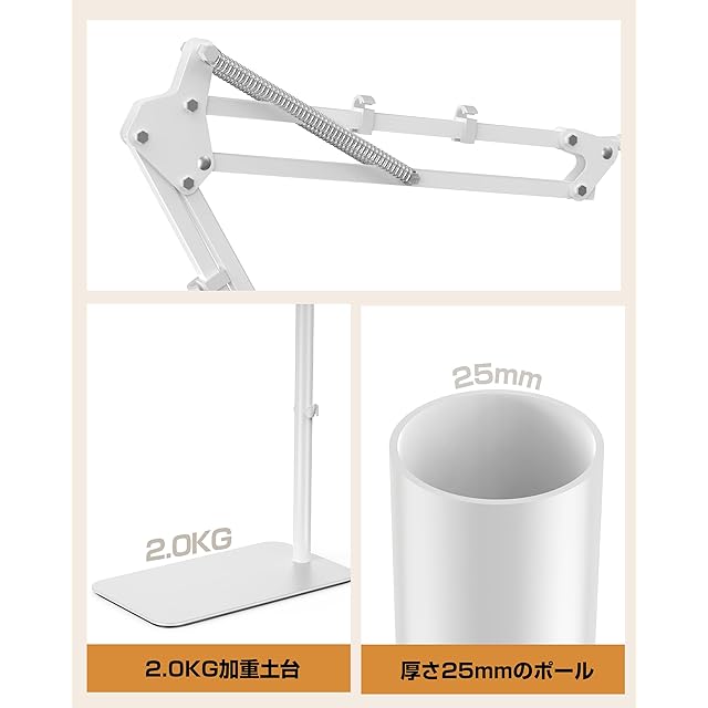 商品名:KUUVAN タブレット スタンド 床置き 伸縮式 iPadアーム 寝ながら 4.7-17.3インチ対応 45-140CM高さ調整 2.0KG耐荷重 小物置台付き 土台強化 360度回転 スマホ/タブレット/モバイルモニタ対応 ホワイト