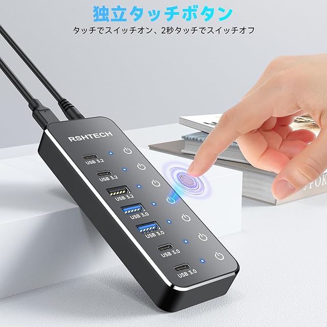 商品名:RSHTECH USB ハブ 10Gbps 7ポート USB-C×4・USB-A×3 セルフ/バス両対応 タッチスイッチ付き ACアダプタ付(100cm) アルミ合金ボディ 高耐久性 ポート拡張 Type-C/USB接続対応 (RSH-ST07C-4)