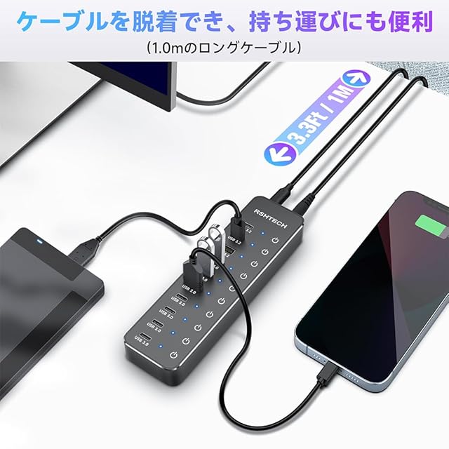 個別スイッチ付き:各USBポートには独立したオン/オフスイッチが付いており、接続機器ごとに電源を管理することができます。これにより、使用していない機器の電源をオフにすることで、無駄な電力をカットし、省エネに貢献します。また、各ポートにはLEDインジケーターが搭載されており、使用中のポートが一目で確認でき、視覚的に操作性が向上します。