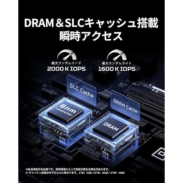 【DRAMキャッシュ搭載】内蔵DRAMキャッシュにより、頻繁なデータアクセスでも卓越した高速応答を発揮します。大量データの連続転送でも速度低下を最小限に抑え、フラッシュメモリへの負荷軽減によってSSDの耐久性向上にも貢献します。