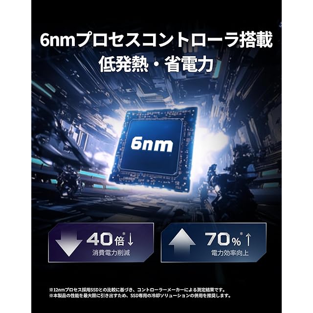 【6nm省電力・低発熱】最先端6nmプロセスで製造された高効率コントローラーを採用。従来世代(12nm)に比べ電力効率が大幅に向上し発熱を抑制、ヒートシンク非搭載でも長時間にわたり安定したパフォーマンスを維持できます。熱による速度低下を防ぎ、PC環境への熱負荷も低減します。