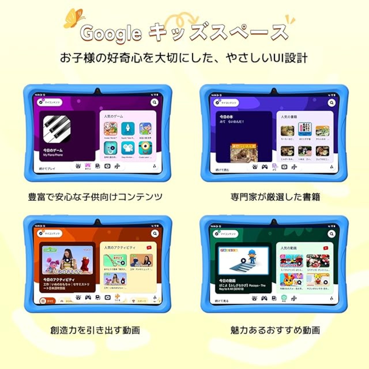 【遊びながら自然に成長】TABWEEの子ども向けタブレットには、Google公式のKids Spaceが搭載されています。子ども専用に設計された楽しく学べる空間で、「遊ぶ」「読む」「見る」「作る」の4つのカテゴリーから、子どもが自ら学び成長できるよう導きます。絵本や知育漫画、児童書のほか、アルファベットや数字の基礎学習、プログラミングなどの教育アプリを厳選。さらに、YouTube Kidsの安全な動画や楽しいゲームも利用可能で、遊びながら自然に学習習慣が身につきます。親御さんも安心して子どもに使わせられる、充実した内容の知育タブレットです。