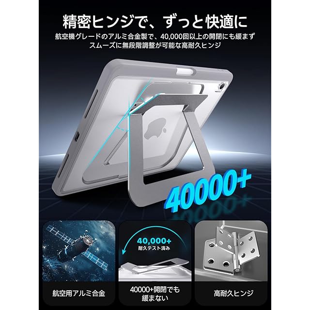 【安定感のある設計で、作業に集中】:HEIGKOIK iPad 第11世代 ケース(A16,2025)は、日常使いに求められる「安定性」と「使いやすさ」を考えて設計されています。スタンド部分には航空機グレードのアルミニウム素材を使用し、独自の「トラホールド」ヒンジ構造により、約40000回の開閉テストをクリア。タイピングや動画視聴中でも、ぐらつきにくく、しっかりと自立します。従来のレザーケースで感じやすい不安定さを抑え、より快適な作業環境をサポートします。